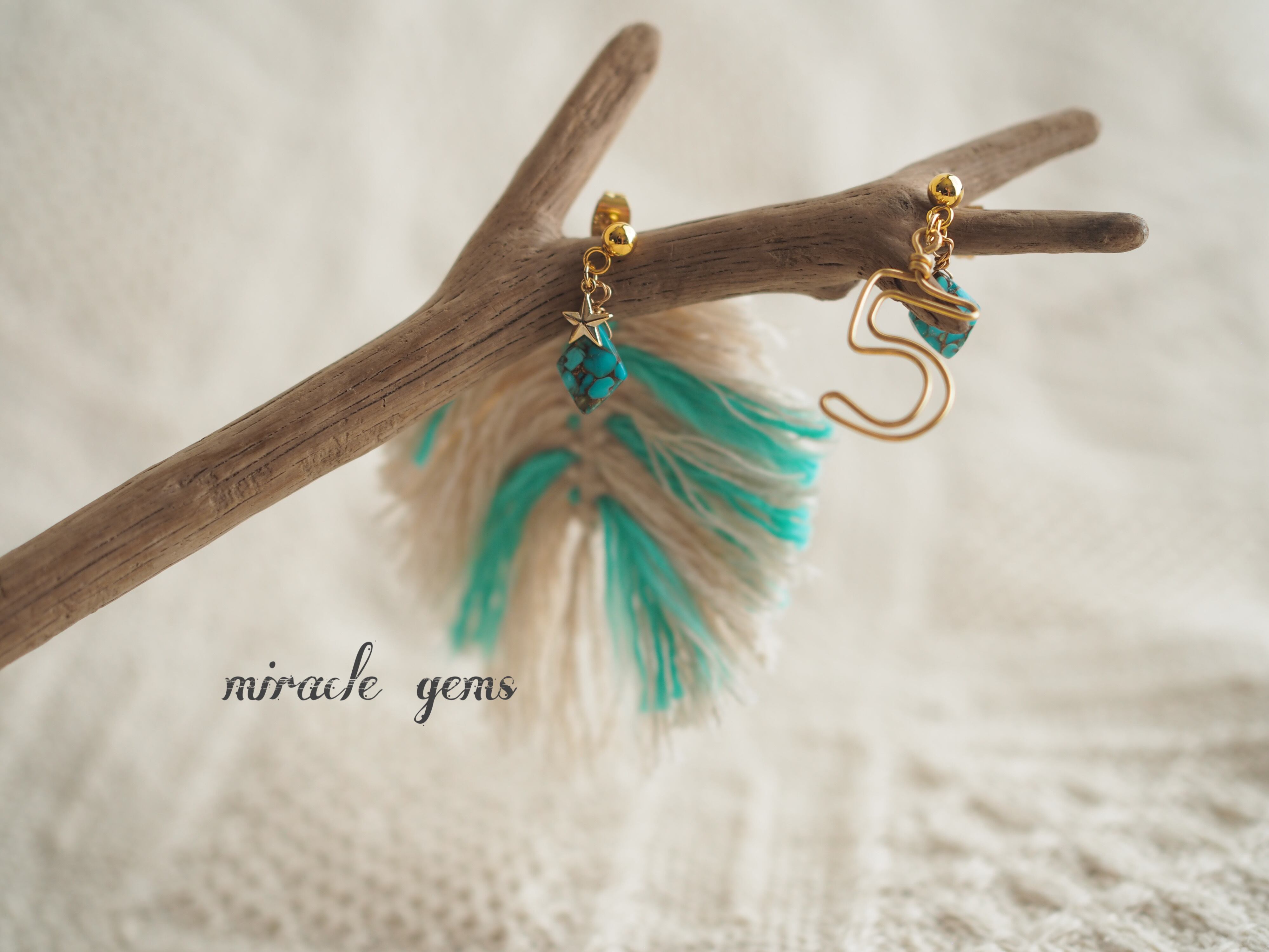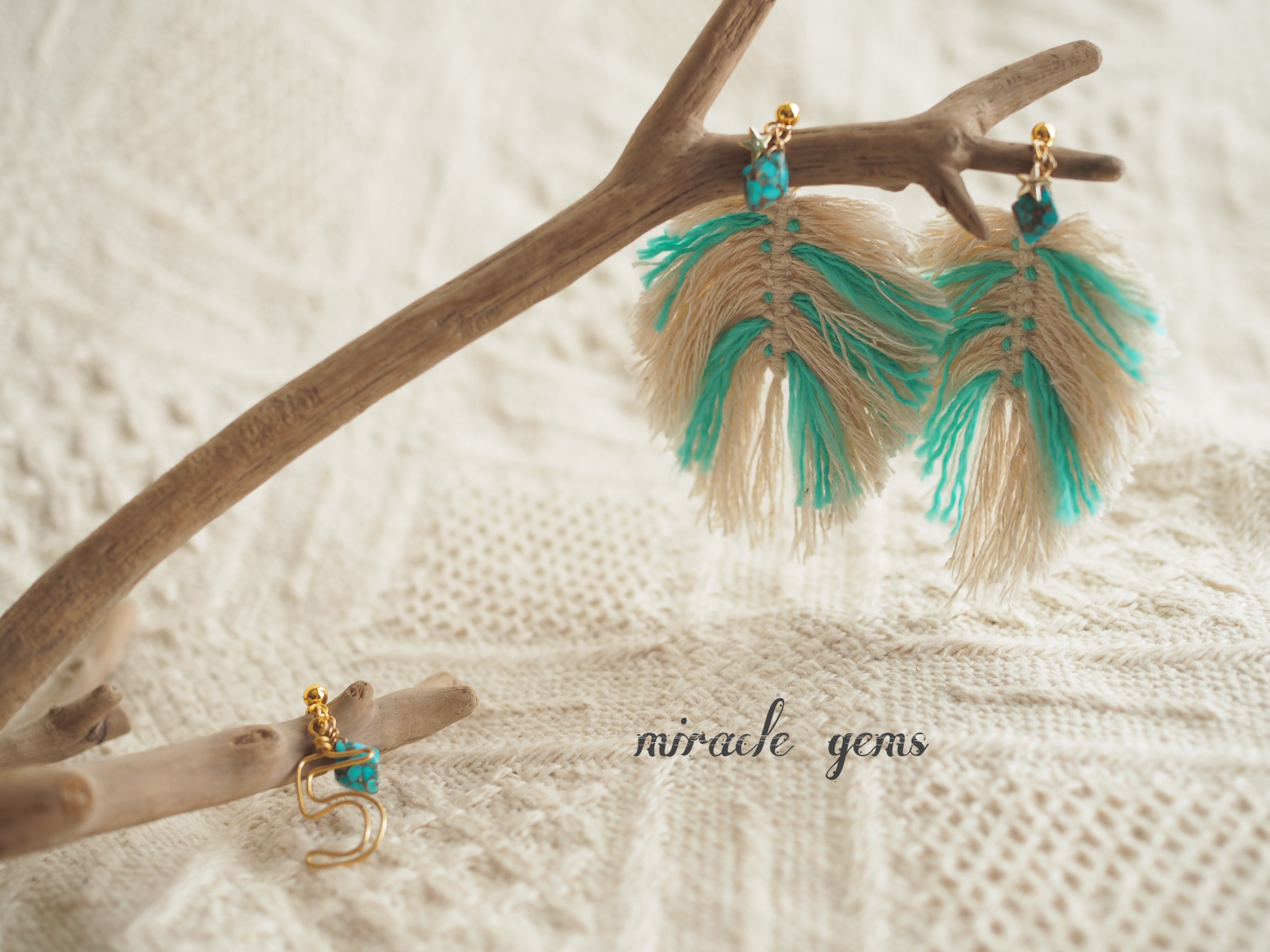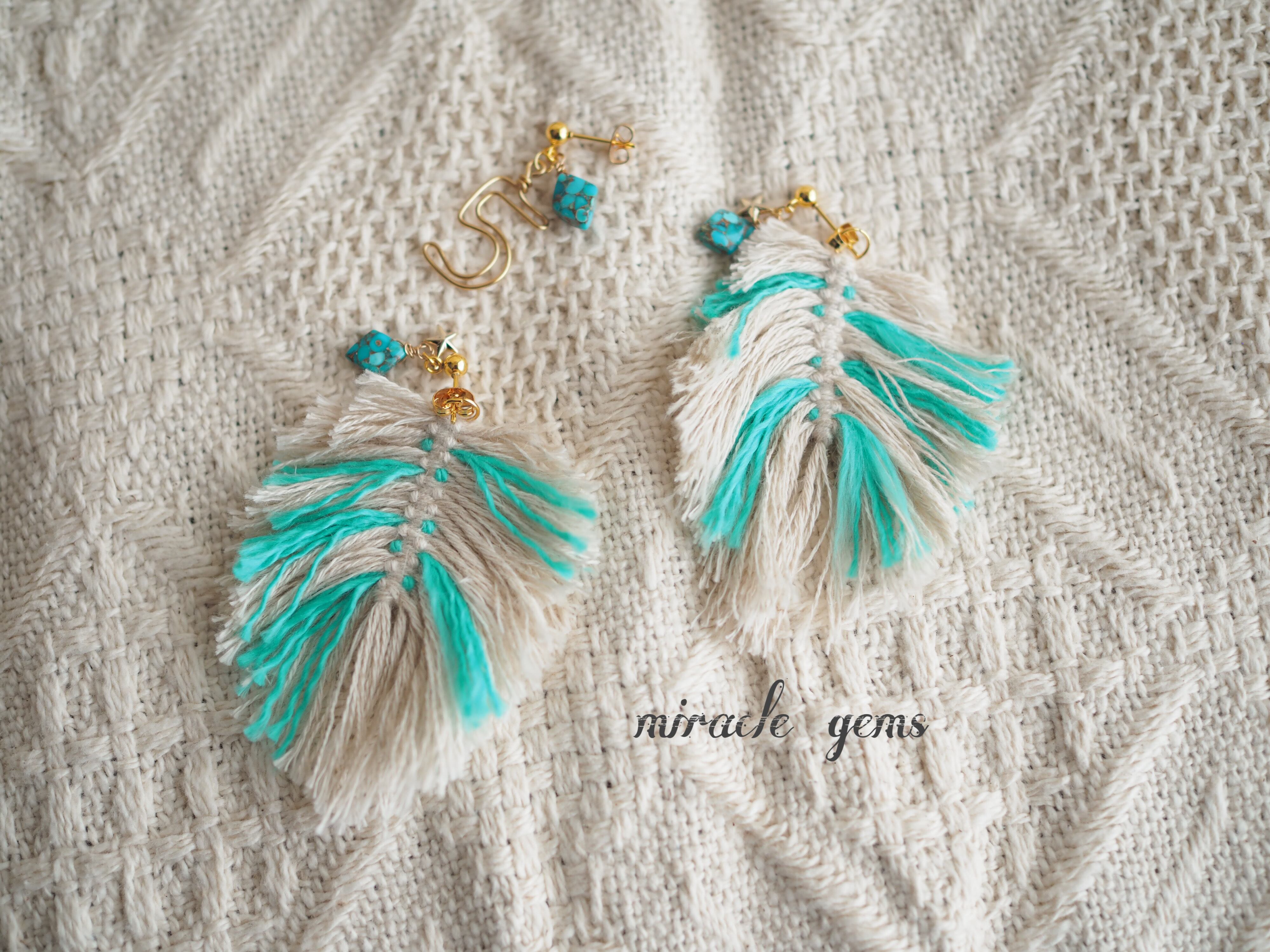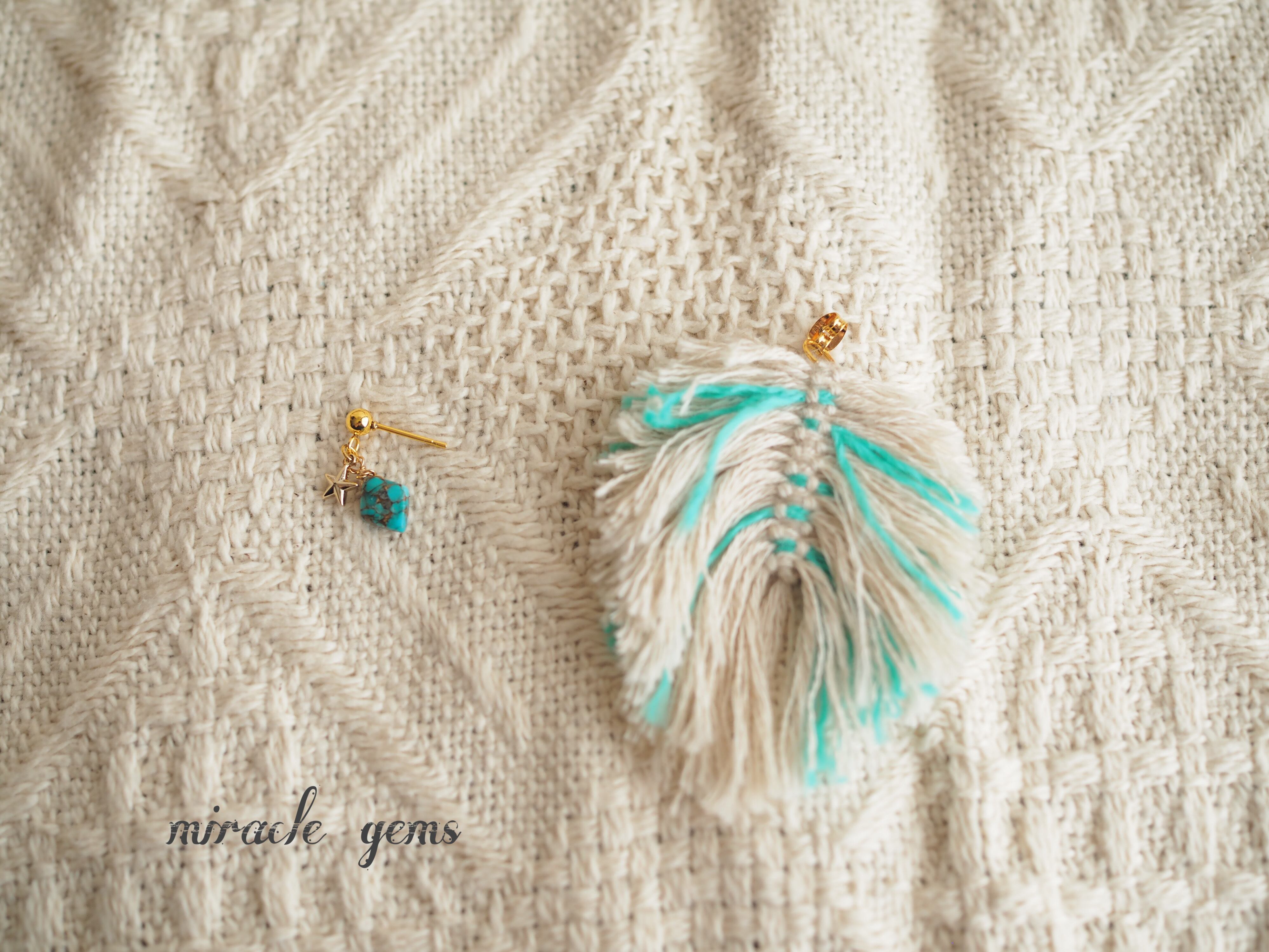 数秘「5」のピアスはキャッチ部分にマクラメフェザーが着いてます。