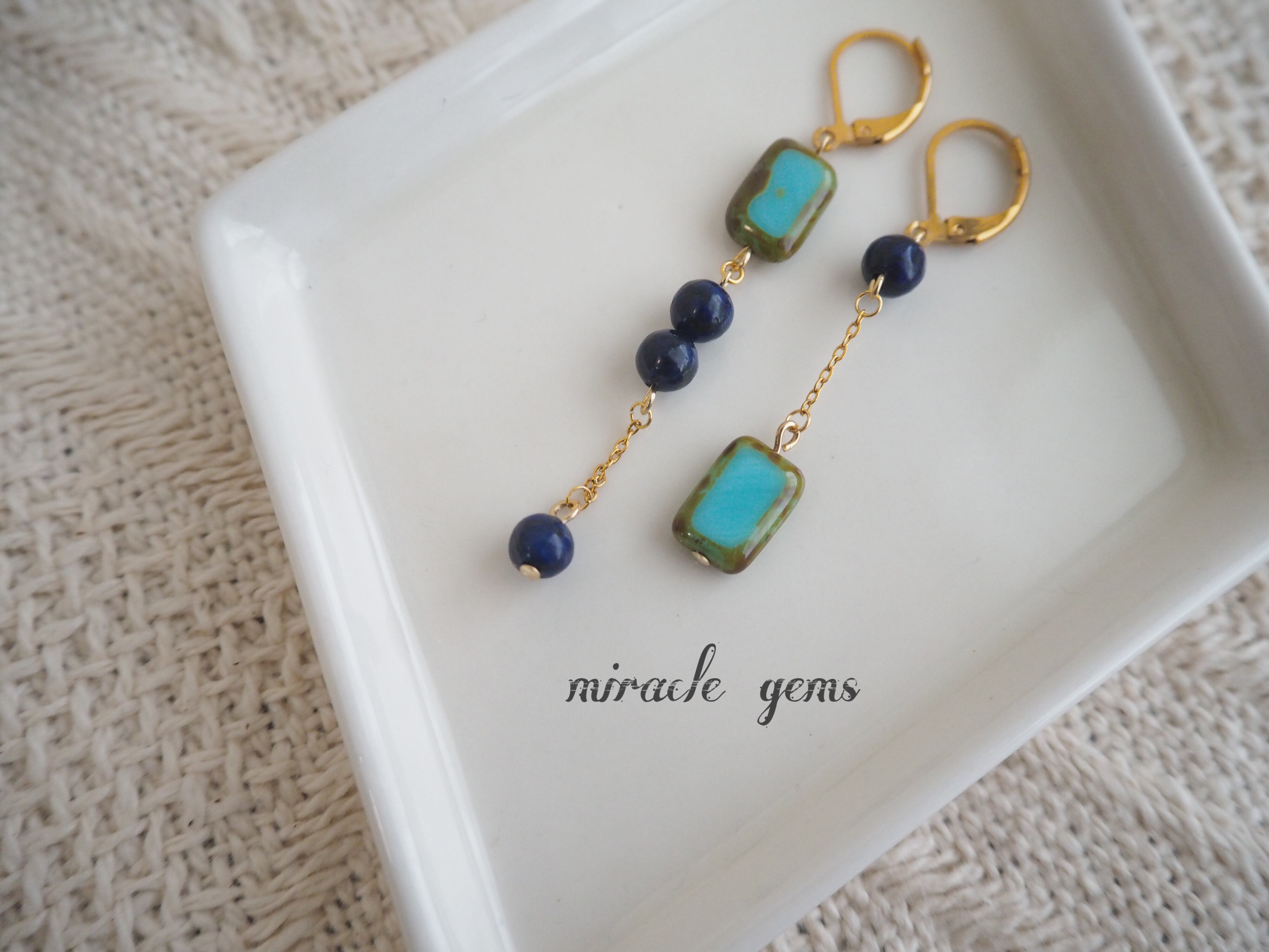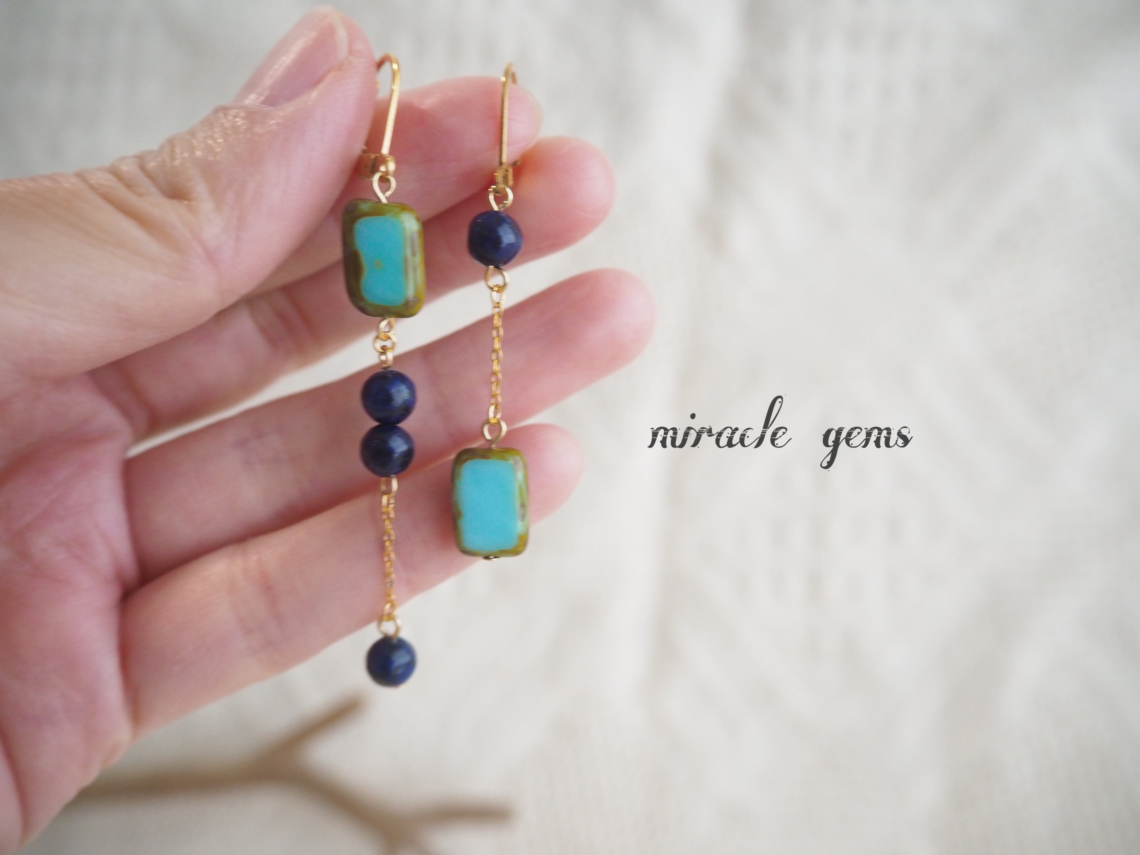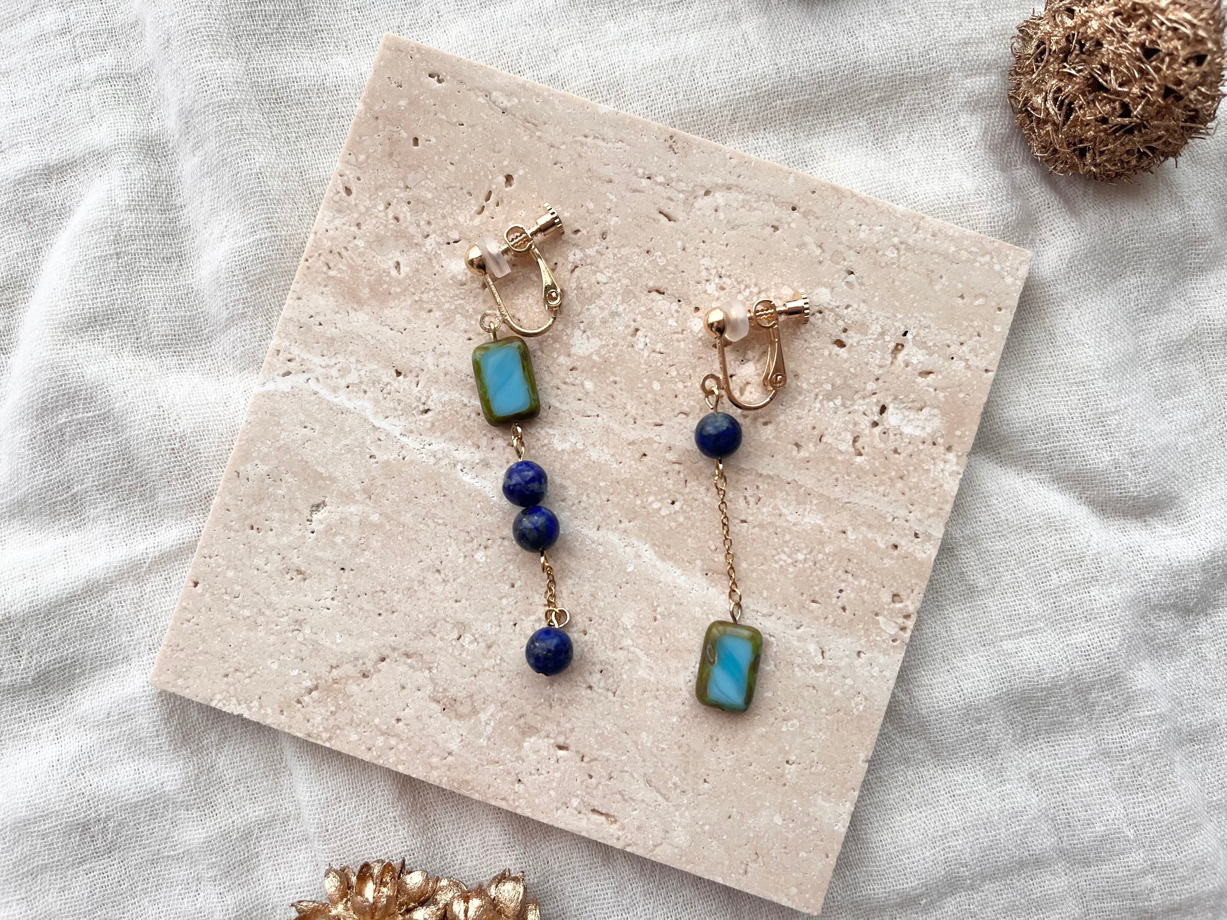 青と水色で鮮やかな、アシンメトリーピアスです。