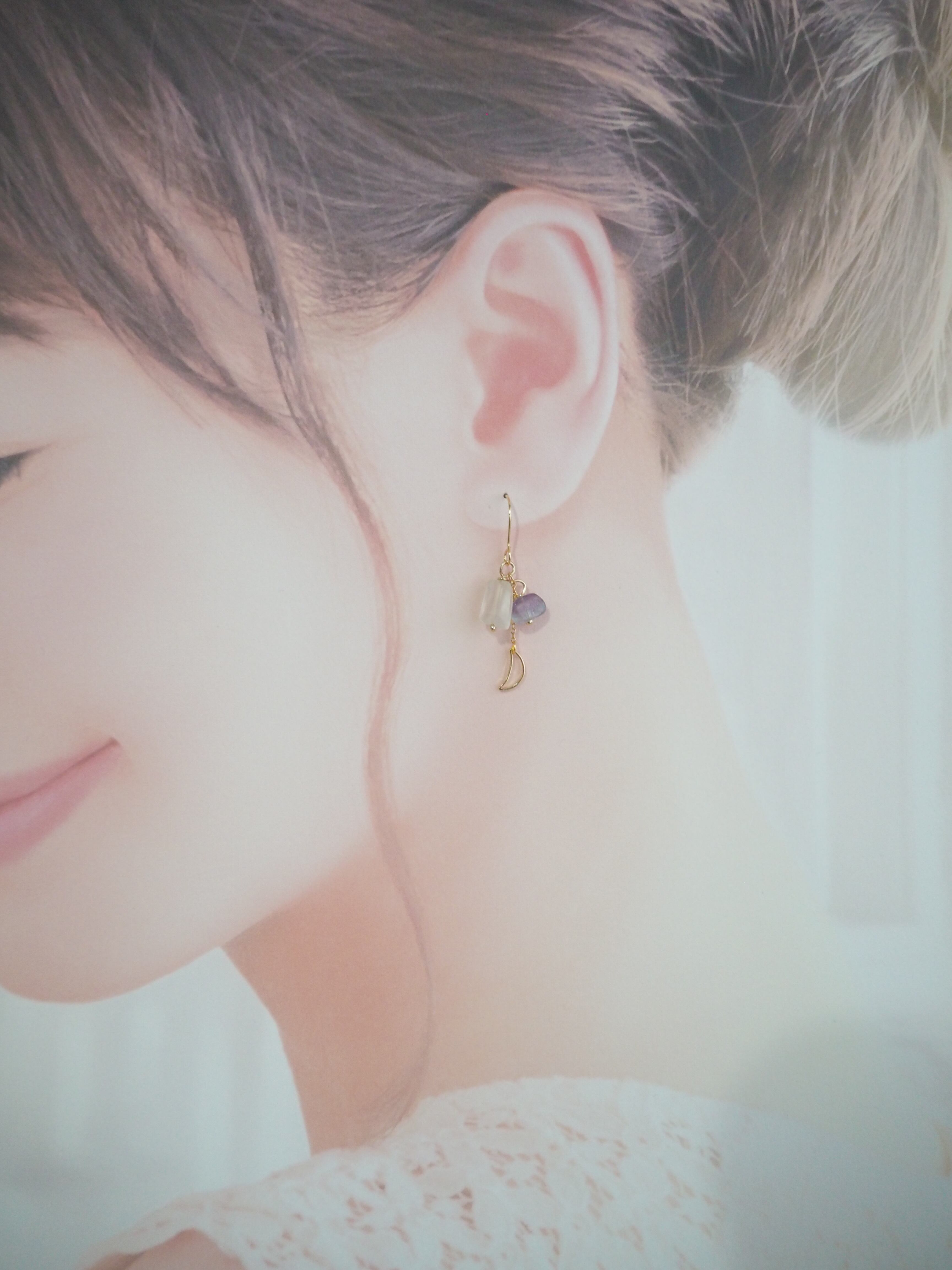 オーダーで天然石ムーンストーン、アクアマリン、フローライトを使用したピアスをお作りさせて頂きました。