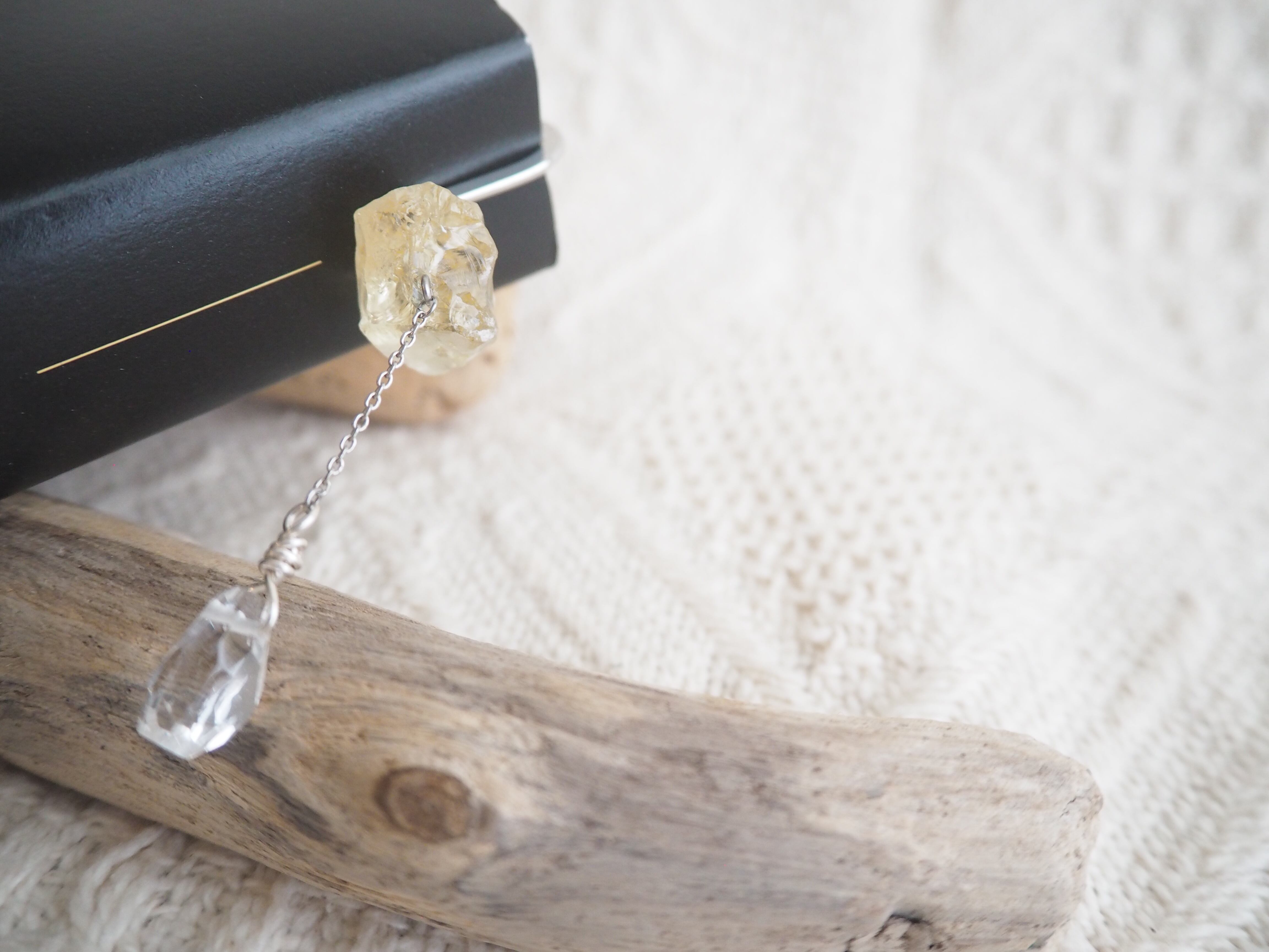 シトリンは砂糖菓子みたいな原石を使用してます。チェーンに繋げて多面カットのクリスタルを付けました。