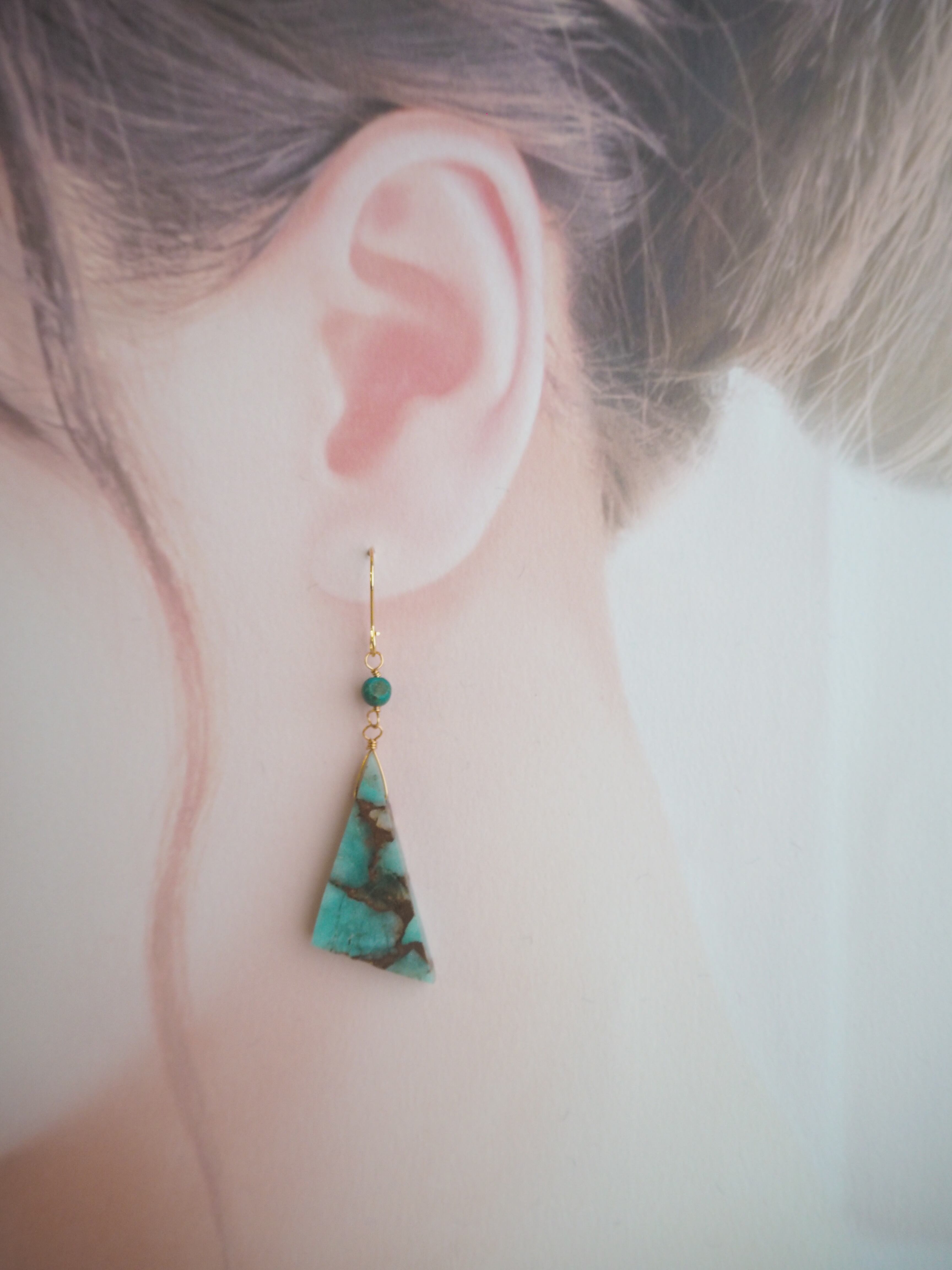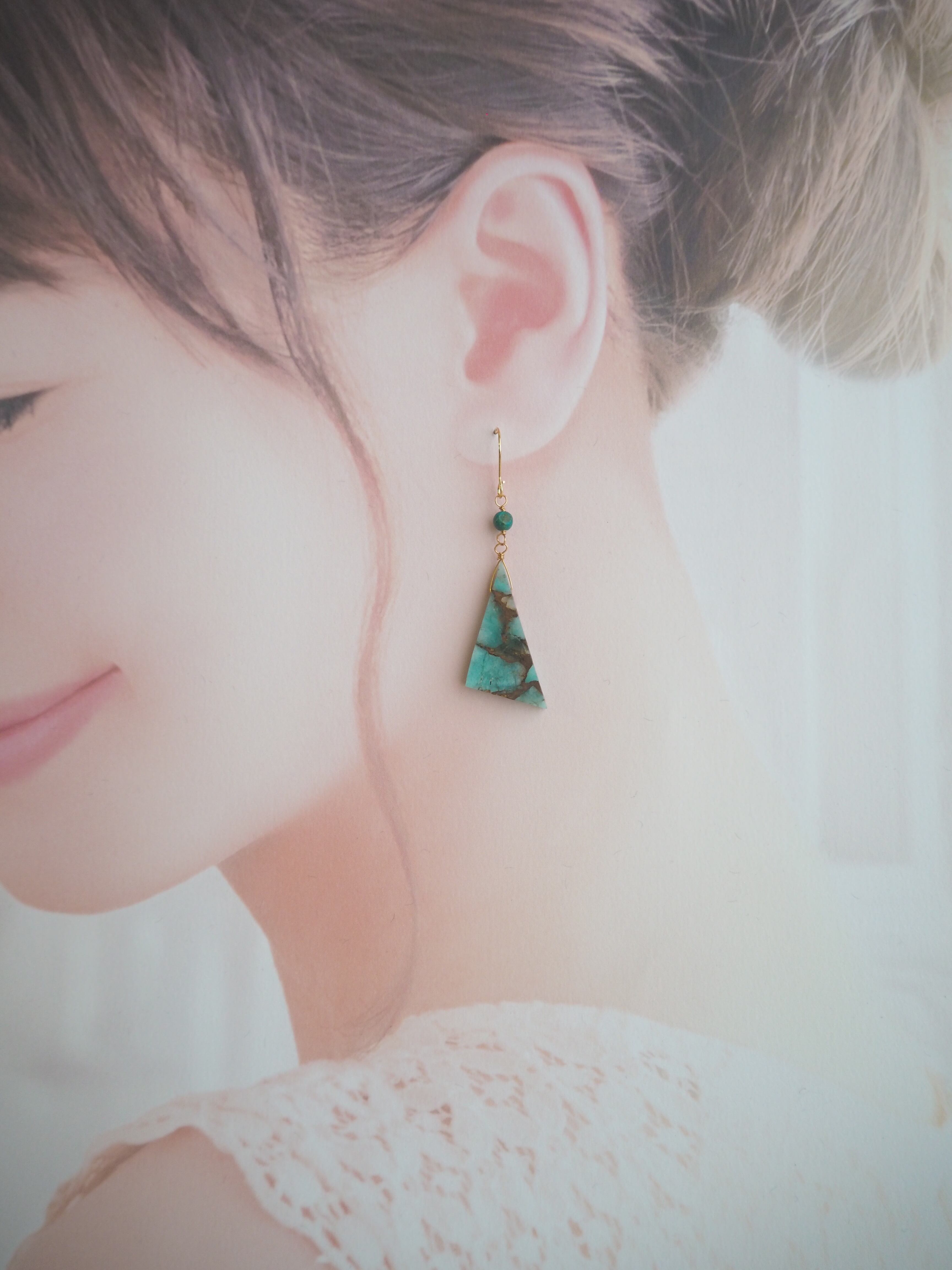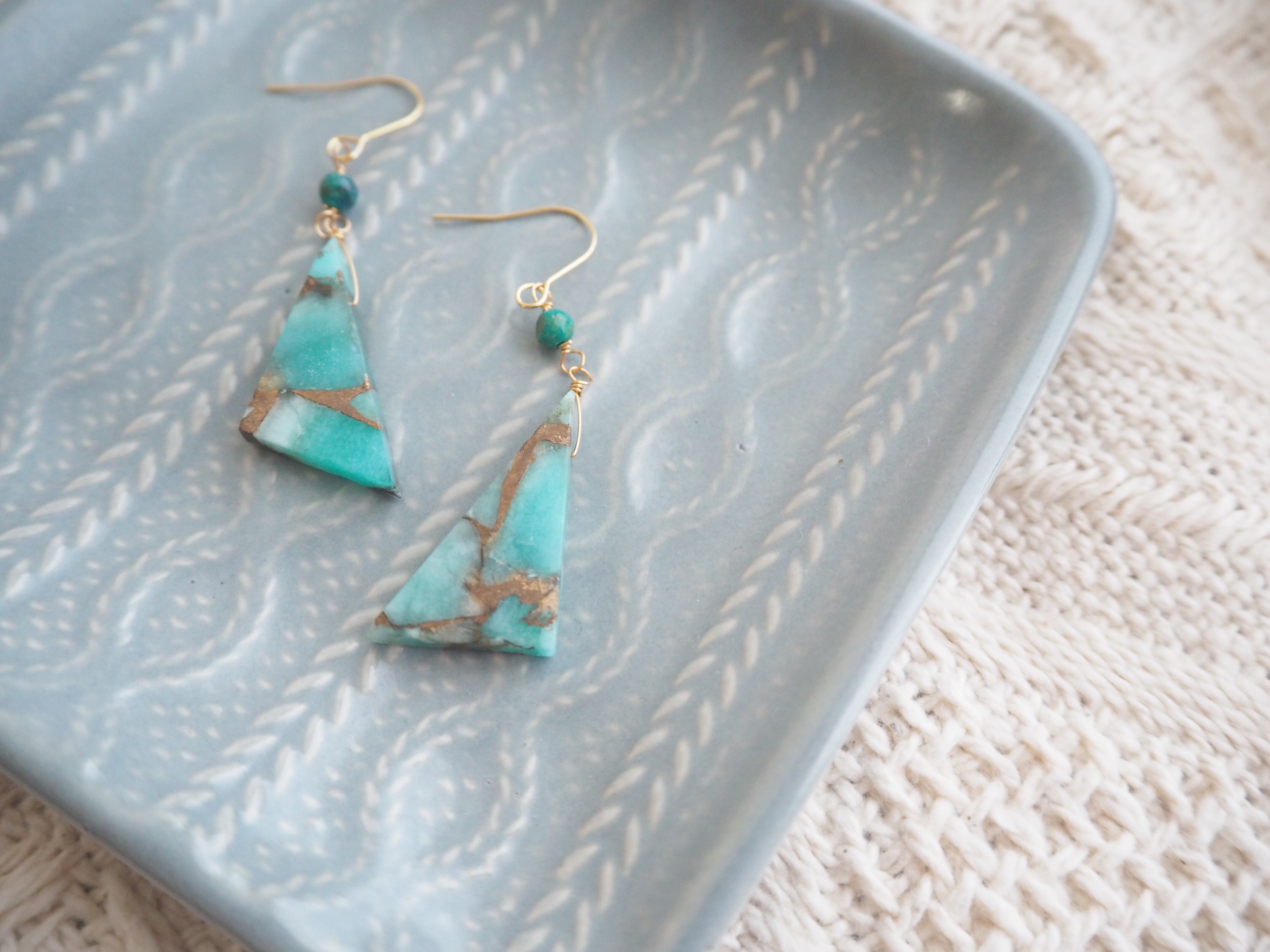 コッパーアマゾナイトとアズライトを使用したピアスです。
