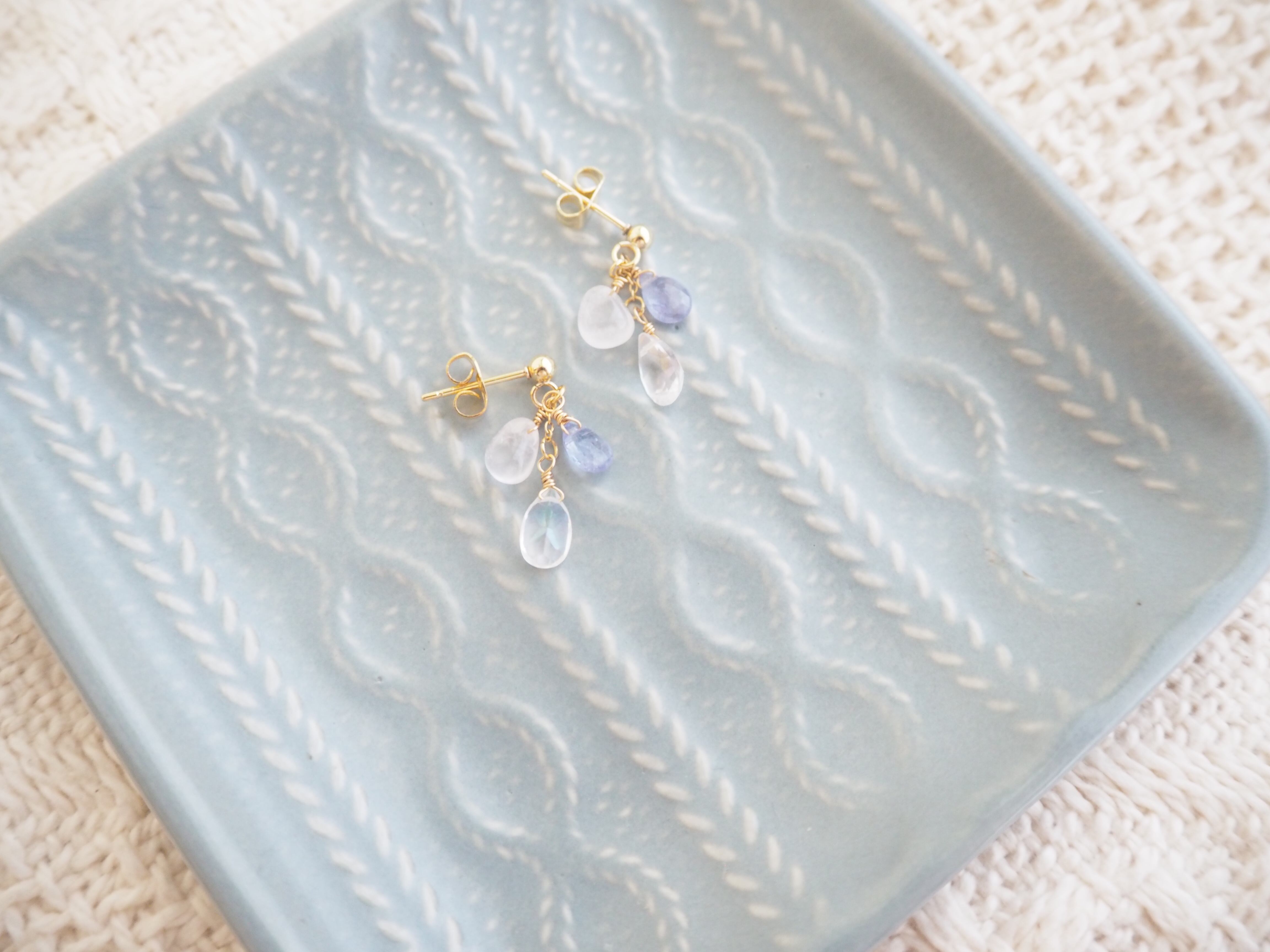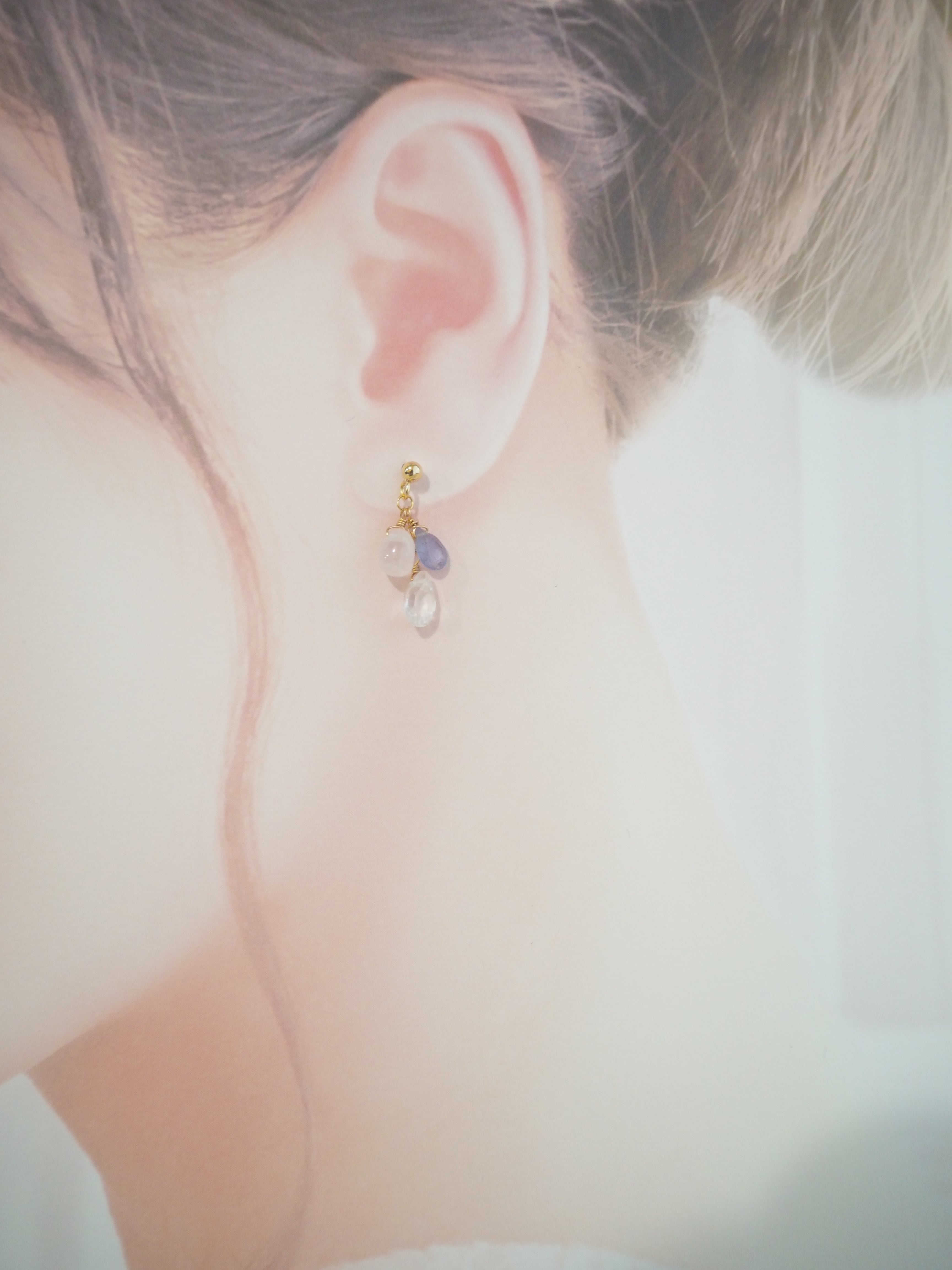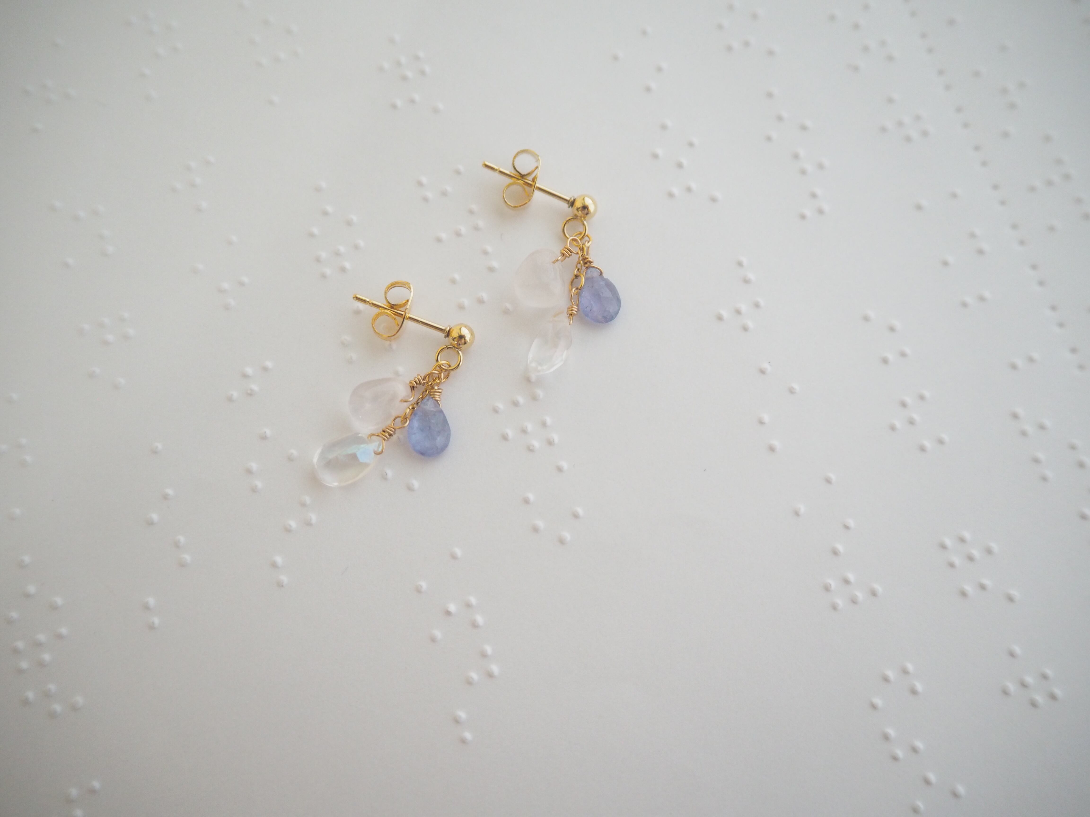 レインボーオーラ、タンザナイト、ローズクォーツを使用したピアスです。